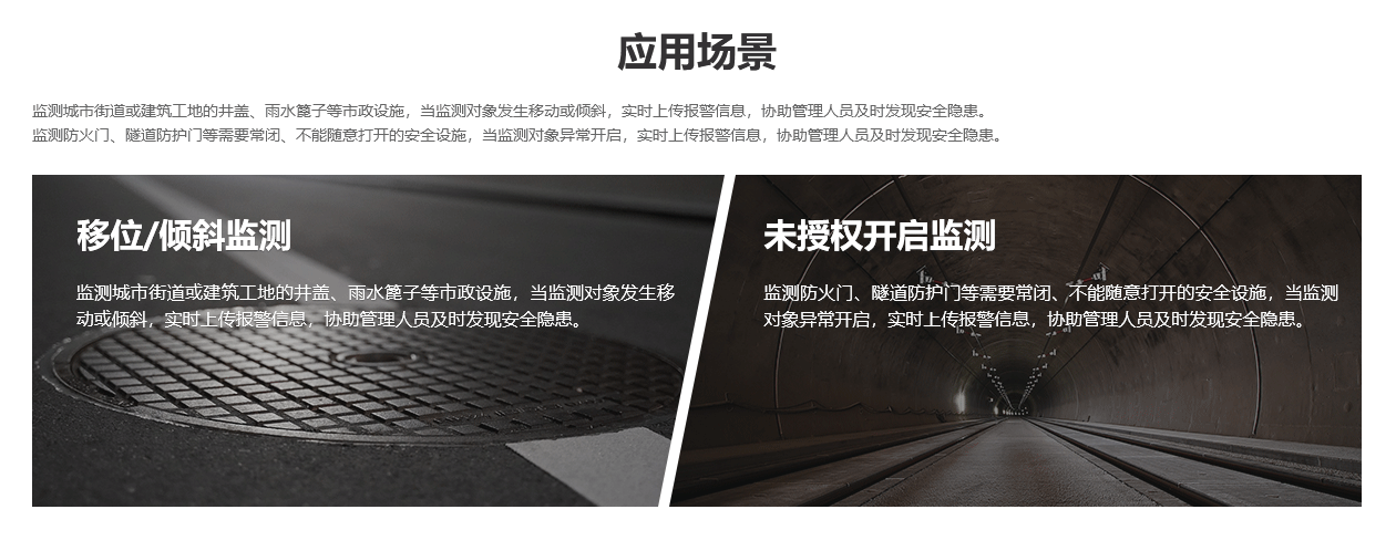 監(jiān)測(cè)城市街道或建筑工地的井蓋、雨水篦子等市政設(shè)施,當(dāng)監(jiān)測(cè)對(duì)象發(fā)生移動(dòng)或傾斜,實(shí)時(shí)上傳報(bào)警信息,協(xié)助管理人員及時(shí)發(fā)現(xiàn)安全隱患。
