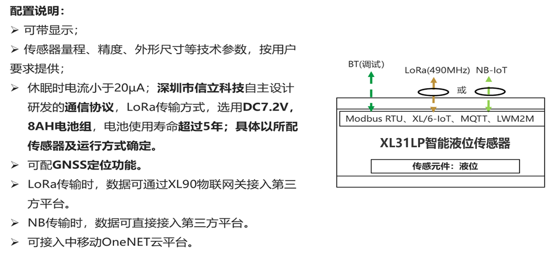 XL31LP智能液位傳感器,集成傳感元件、信息處理、無線通訊、電池供電等于一體。通訊中斷保存數(shù)據(jù),通訊恢復重傳數(shù)據(jù),超限主動上傳數(shù)據(jù),電池能量低上傳報警數(shù)據(jù)。