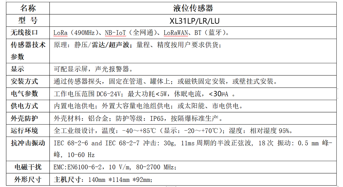 XL31LP智能液位傳感器技術參數(shù)