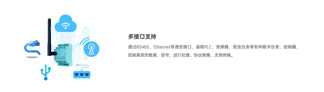 既可作為采集模塊,直接采集設備的數(shù)據(jù)上傳、聯(lián)網;也可作為無線接收端,讀取采集模塊、智能傳感器的數(shù)據(jù),進行通訊處理、協(xié)議轉換,轉發(fā)數(shù)據(jù)至平臺。