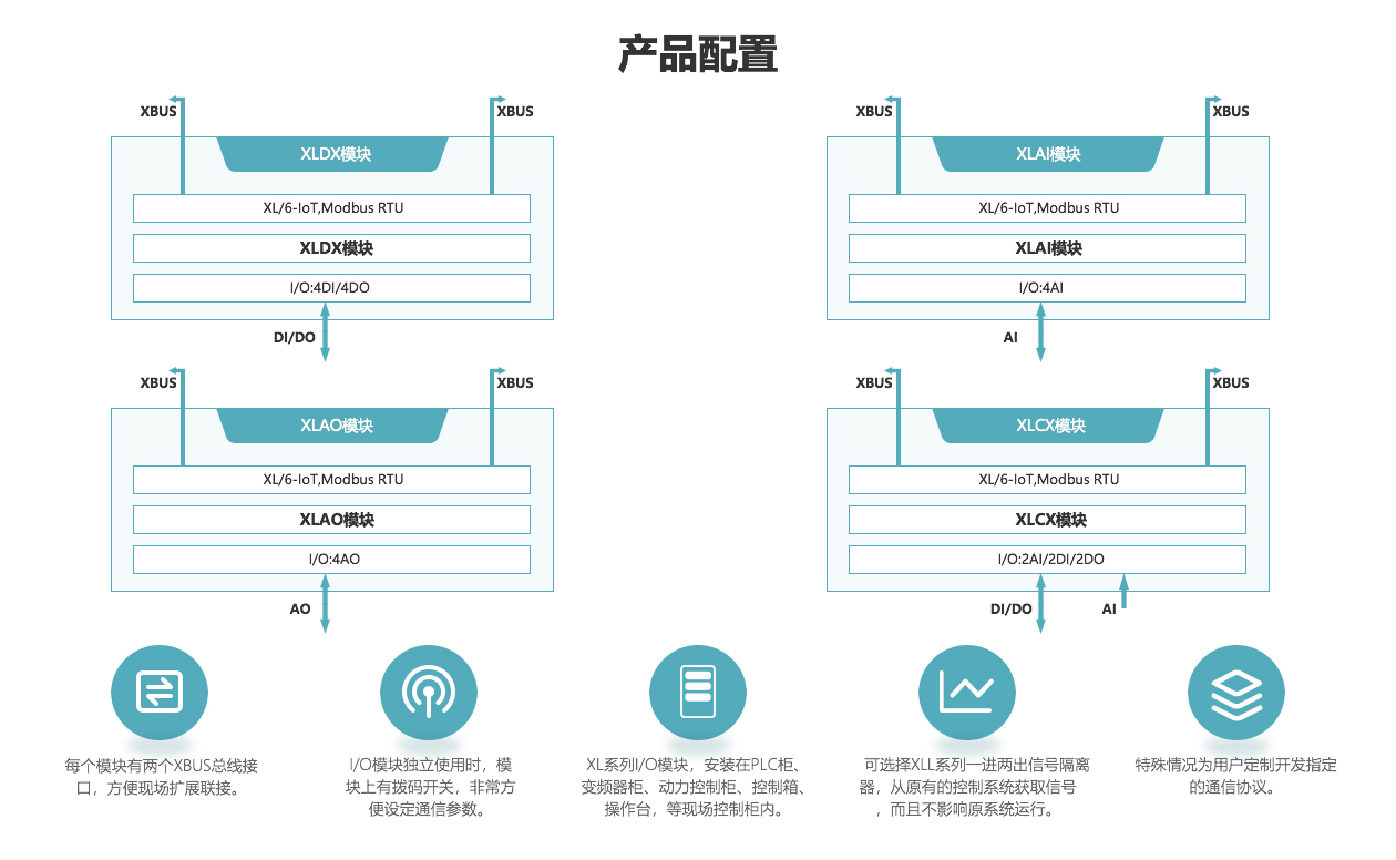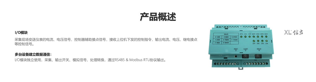XL系列I/O模塊,采集模擬、開關(guān)信號(hào),輸出模擬、開關(guān)信號(hào),支持RS485、XBUS接口,Modbus RTU和XL/6通信協(xié)議。模塊化設(shè)計(jì),方便擴(kuò)展輸入、輸出數(shù)量。