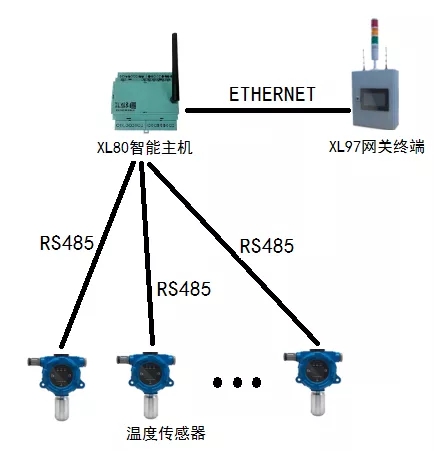 我司低溫檢測監(jiān)測系統(tǒng),選用XL97網(wǎng)關(guān)終端。通過采用RS485線的方式將各監(jiān)測點(diǎn)的數(shù)據(jù)傳輸至XL80智能主機(jī),智能主機(jī)再通過ETHERNET方式將數(shù)據(jù)上傳至XL97網(wǎng)關(guān)終端,網(wǎng)關(guān)終端將傳來的數(shù)據(jù)進(jìn)行分析處理后,直觀的將監(jiān)測點(diǎn)的實時溫度值顯示出來。