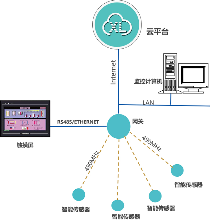 智能傳感器,通過LoRa(490MHz)上傳數(shù)據(jù)至物聯(lián)網(wǎng)關(guān)