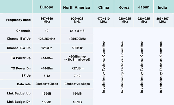 LoRa使用的是免授權ISM頻段,但各國或地區(qū)的ISM頻段使用情況是不同的。在中國市場,由中興主導的中國LoRa應用聯(lián)盟(CLAA)推薦使用了470-518MHz。而470-510MHz這個頻段是無線電計量儀表使用頻段。由于LoRa是工作在免授權頻段的,無需申請即可進行網絡的建設,網絡架構簡單,運營成本也低。LoRa聯(lián)盟正在全球大力推進標準化的LoRaWAN協(xié)議,使得符合LoRaWAN規(guī)范的設備可以互聯(lián)互通。下圖是LoRa聯(lián)盟規(guī)范里提到的部分使用頻段: