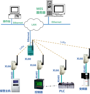 XL80主機,通過LoRa無線接口,從XL66無線讀取設備的運行數據,通信協議轉換處理后,通過Ethernet,轉發(fā)數據至MES。
