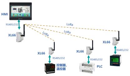 一臺(tái)XL66與多臺(tái)XL66連接,實(shí)現(xiàn)一對(duì)多,RS485/232設(shè)備間無(wú)線通信。