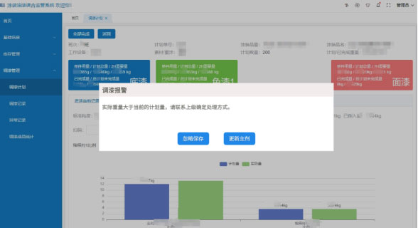 智能更新料重:當(dāng)某種原料倒入過多,系統(tǒng)彈窗報(bào)警,經(jīng)上級(jí)權(quán)限確認(rèn)后系統(tǒng)根據(jù)給定配比,自動(dòng)更新各原料所需重量。