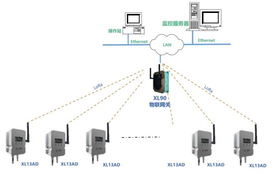 XL13AD無線大氣壓差傳感器采用LoRa無線通信模塊,將采集到的壓差數(shù)據(jù)無線傳輸至XL90網(wǎng)關(guān);XL90網(wǎng)關(guān)通過局域網(wǎng)接入監(jiān)管服務(wù)器,或選擇XL97網(wǎng)關(guān)終端,實現(xiàn)就地監(jiān)控。