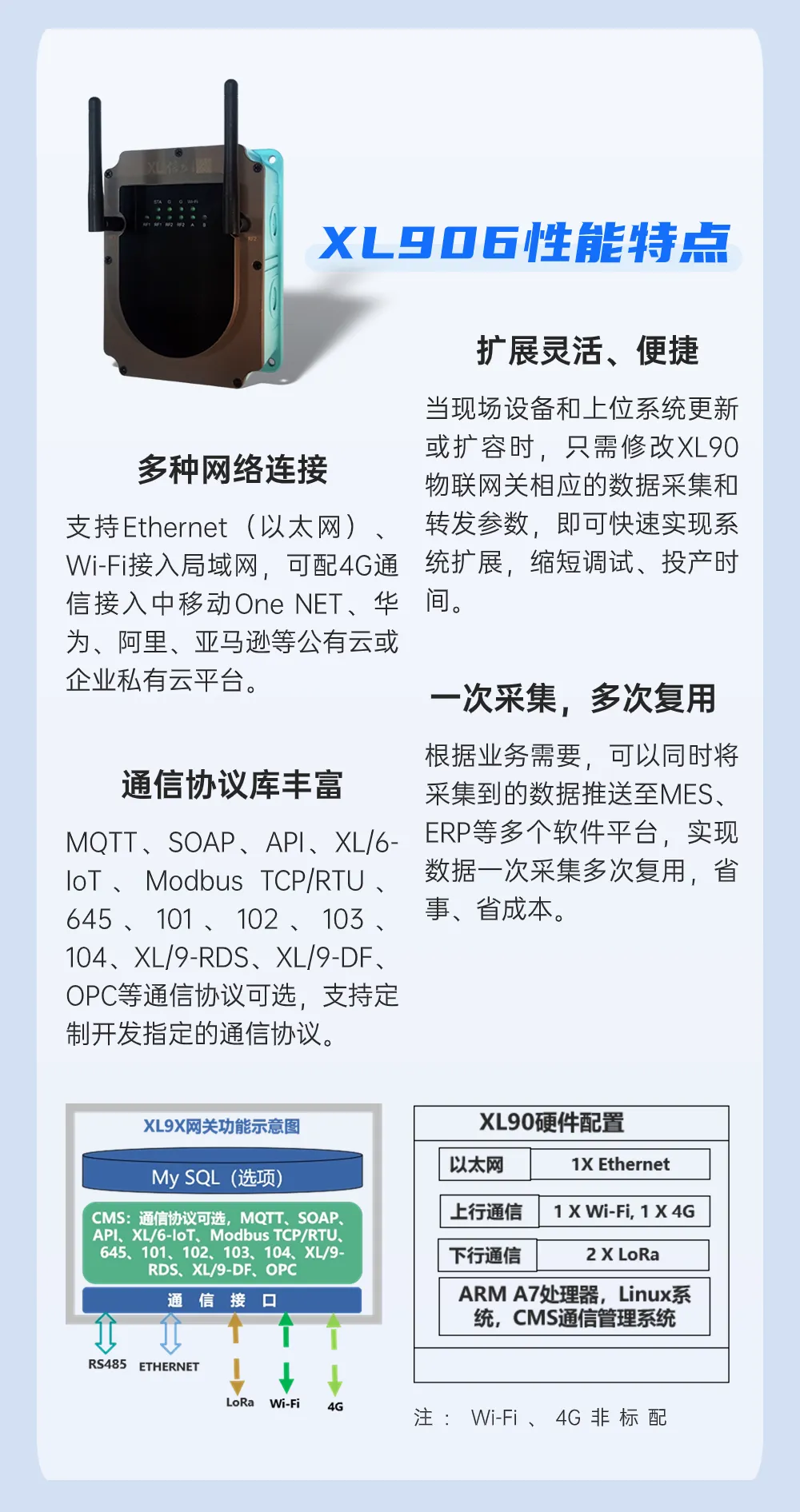 XL906物聯(lián)網(wǎng)關(guān),無(wú)線讀取監(jiān)測(cè)節(jié)點(diǎn)的數(shù)據(jù),進(jìn)行處理、協(xié)議轉(zhuǎn)換,通過(guò)以太網(wǎng)(Ethernet)或Wi-Fi,轉(zhuǎn)發(fā)數(shù)據(jù)至MES、ERP、EMS等多個(gè)工廠數(shù)字化平臺(tái),實(shí)現(xiàn)數(shù)據(jù)聯(lián)網(wǎng)、集中監(jiān)控分析。