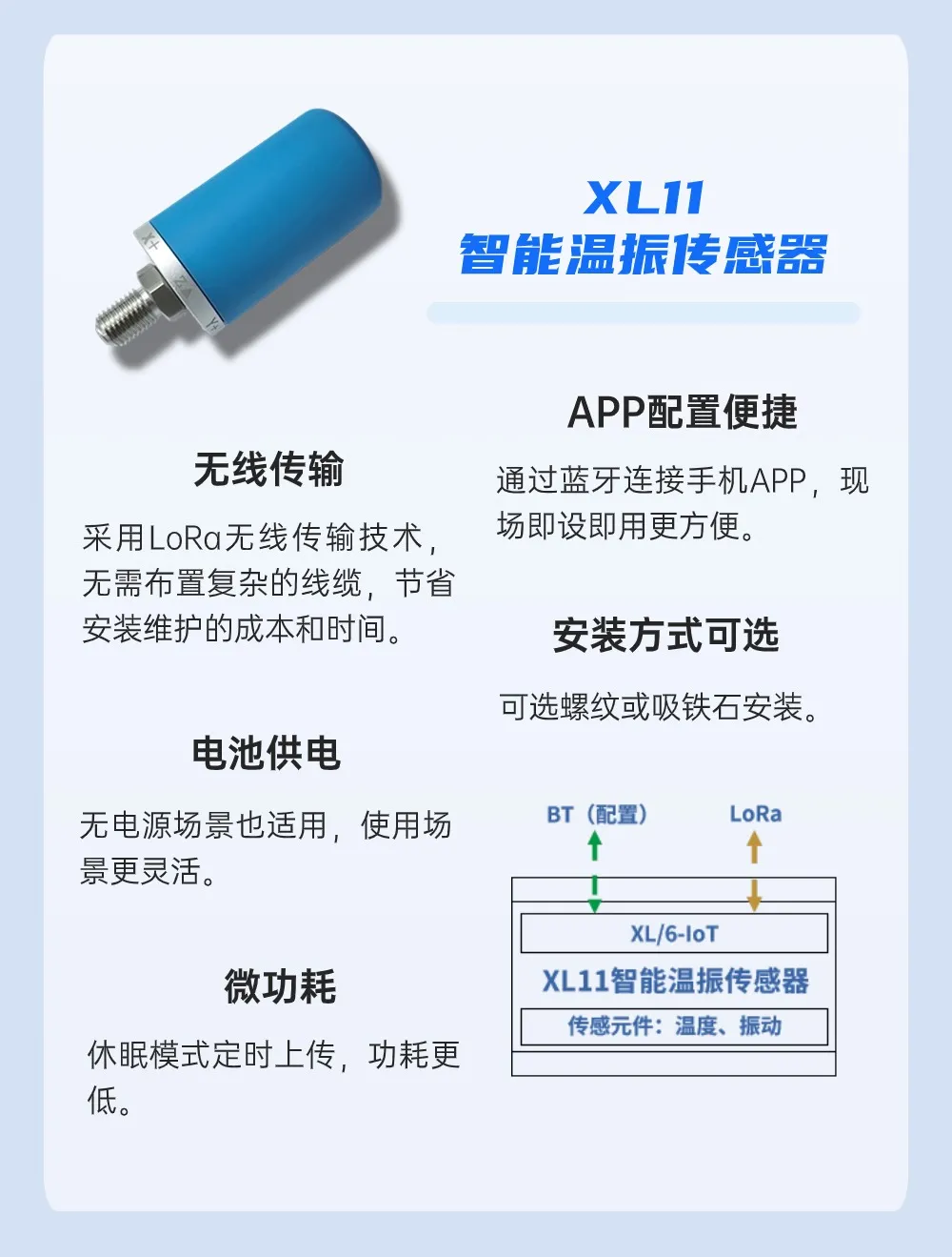 選擇XL11智能溫振傳感器,安裝在高爐、轉爐、連鑄機、熔煉爐等設備的電機和減速機上,實時采集溫度和X、Y、Z三個方向的振動數據,為設備運行狀態(tài)的分析判斷提供數據支撐。