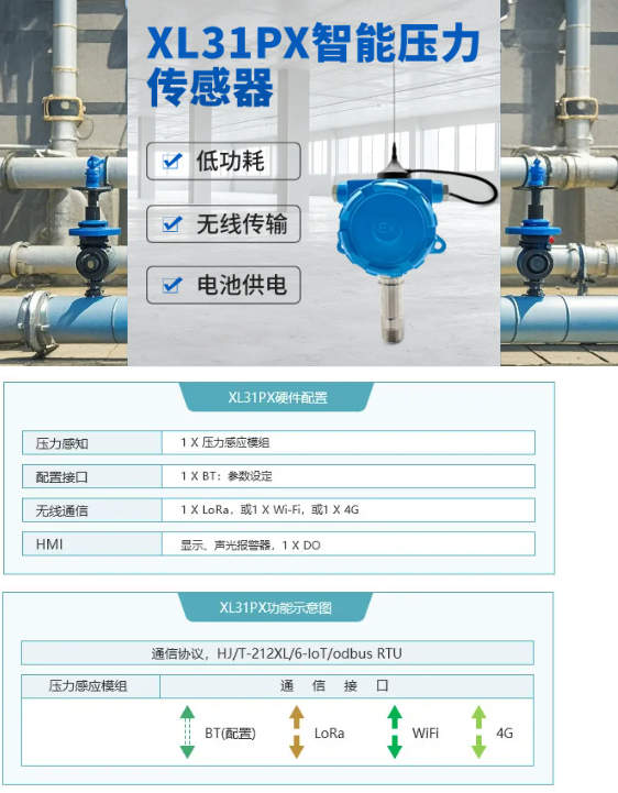 XL31PX智能壓力傳感器通過4G無線通信技術(shù),實現(xiàn)遠(yuǎn)距離、快速傳輸壓力數(shù)據(jù)至云平臺。
